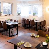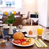 Mit einem reichhaltigen Frühstücksbuffet in freundlichem Ambiente. Lassen Sie sich einfach mal verwöhnen – mit Kaffee, Hörnchen, Müsli, und frischem Obst.